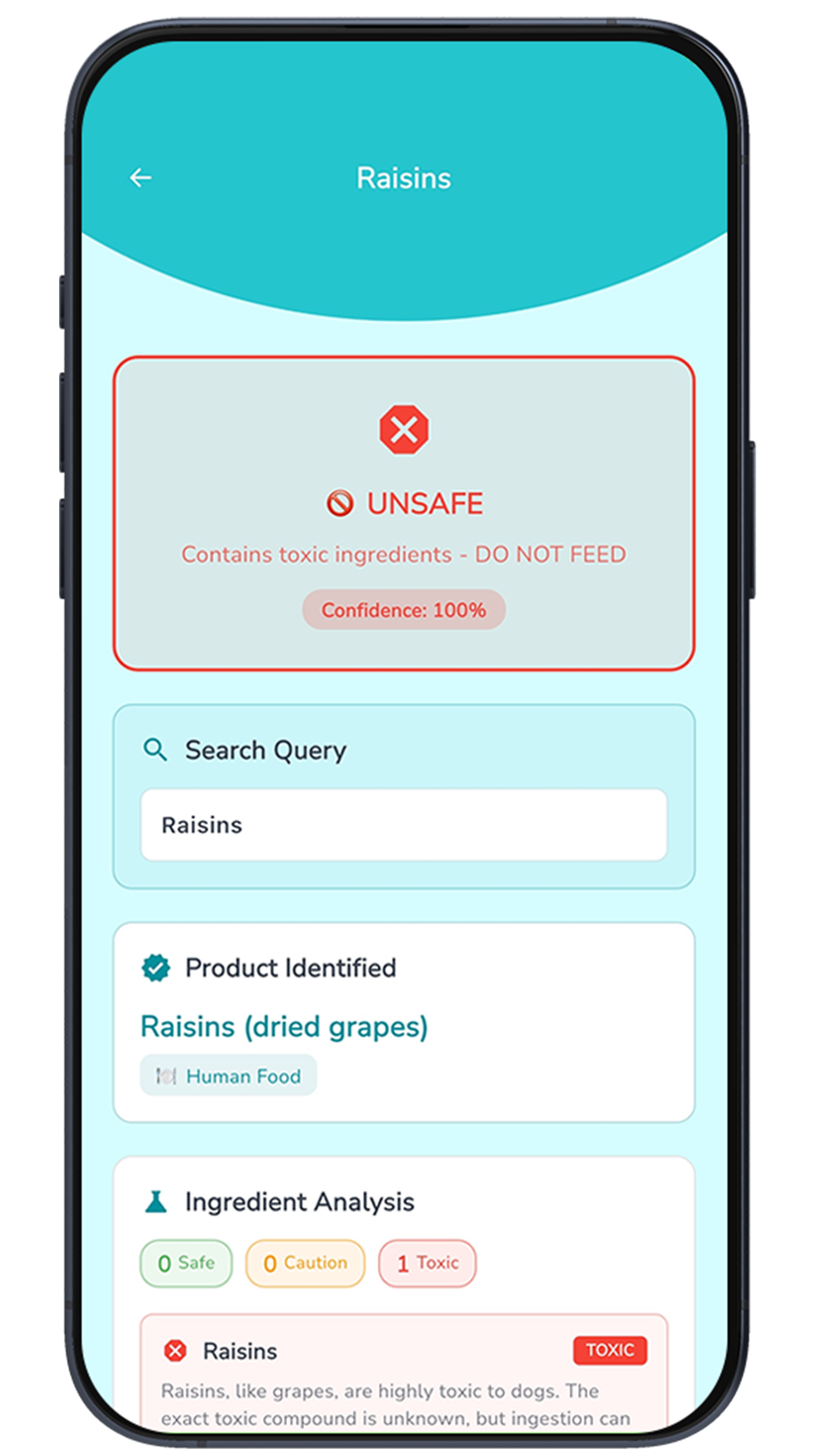 Scan any food in seconds. Know if it's safe before your dog takes a bite.